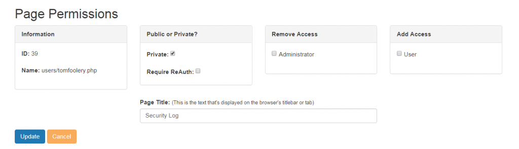 There's also a "Require ReAuth" box you can check that will ask for the user's password before allowing them to see this page if they've been logged in for a while. This is good for preventing people from accessing pages if the user has walked away from the keyboard.