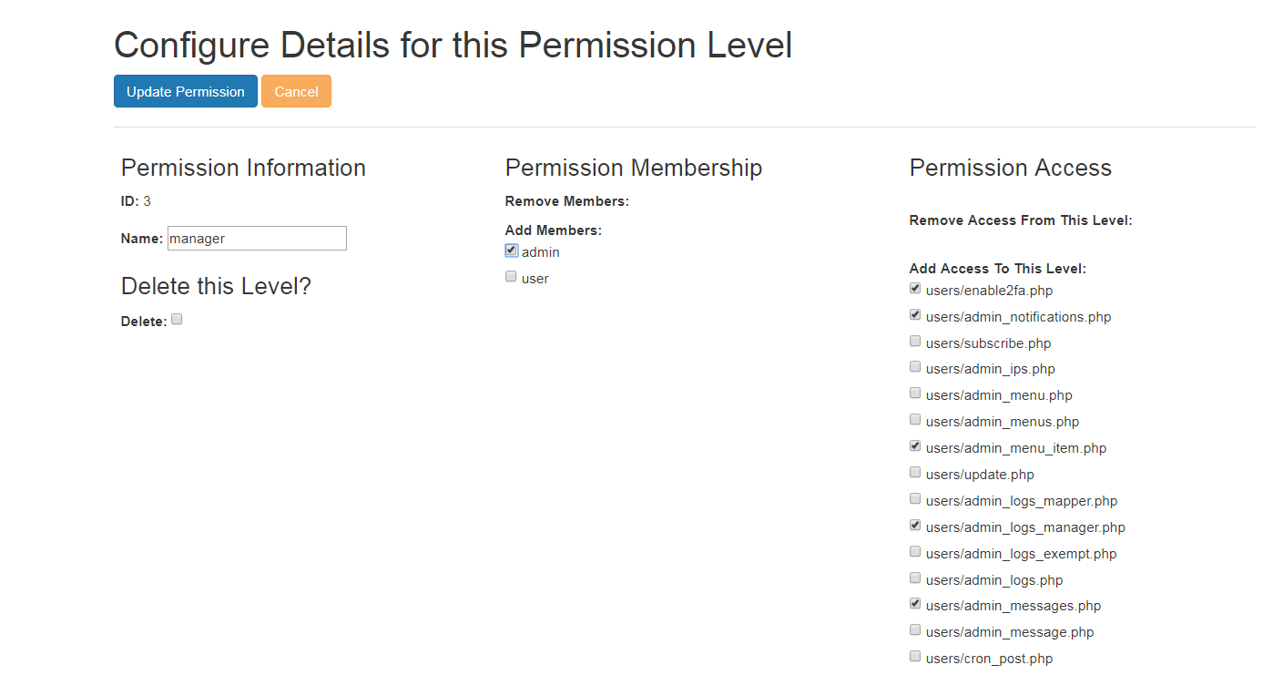 Here, you can do two things really quickly. You can check every user that you want to add to this permission level AND all the pages that you want to be accessible to this permission level. Click update and you're good to go.