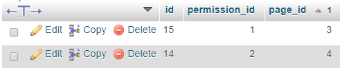 So you have the page with the id of 3 (account.php) and it requires permission_id 1 (user) to access it. Then you have the page with the id 4 (admin.php) and it requires permission_id 2 (administrator) to visit it.
