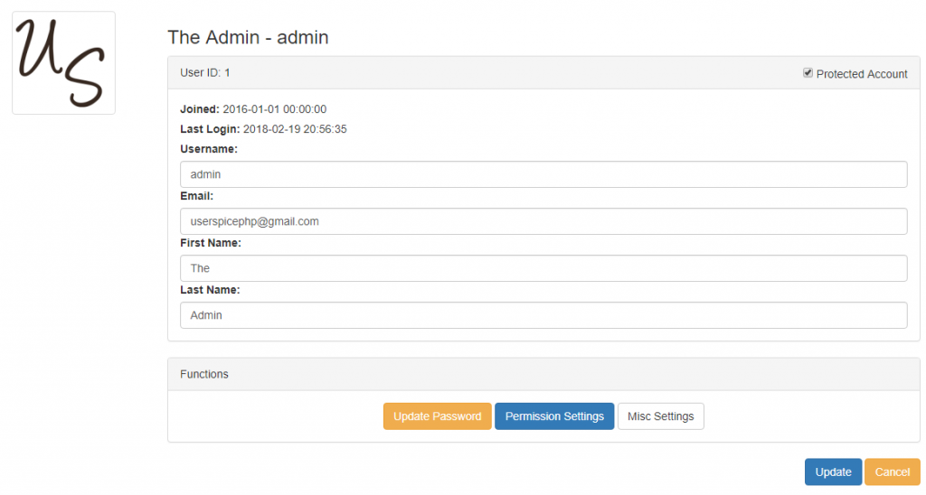 There is one more button that can show up on this page, and it only will if you create a file in usersc/includes called "admin_user_system_settings.php" (there is an example). This button will be called System Settings and will be positioned between the Update Password and Permission Settings button. Once this file is created, the button will show, and the modal will have whatever you put within this custom file.