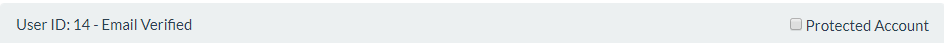 This is a very powerful screen no matter what user you are looking at, as almost every value in that users row in the users table is displayed and can be modified. Lets begin with the Panel Heading bar. This will include the User ID, details about their Email Verified status (will not show if this is turned off in Email Settings) and a Protected Account checkbox. If their email is not verified and this setting is enabled, a checkbox will appear for you to change this value, otherwise it will have text indicating Email Verified (see below). This is a one way change, and requires a database query to reverse.