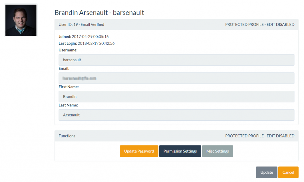 All form fields are disabled, and PHP validation will occur as well to be sure no back-hacking occurs. This goes for the modals as well, you will not be able to perform any actions in them. The Protected Profile box will only show for users within the master account array, as they are the only ones that should be able to assign this value.